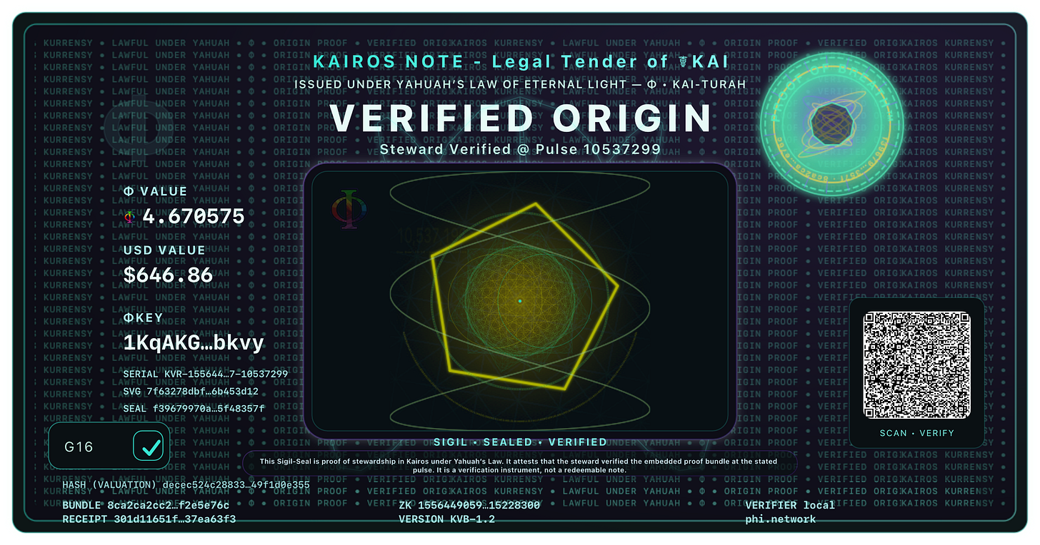 Restorer of ☤Kairos • Harmonic Physicist • Inventor of Resonant Computing™ • Author of the Kai-Klok (KKS-1.0) deterministic breath-time lattice • Builder of Kairos-verified receipt, identity, and value systems.