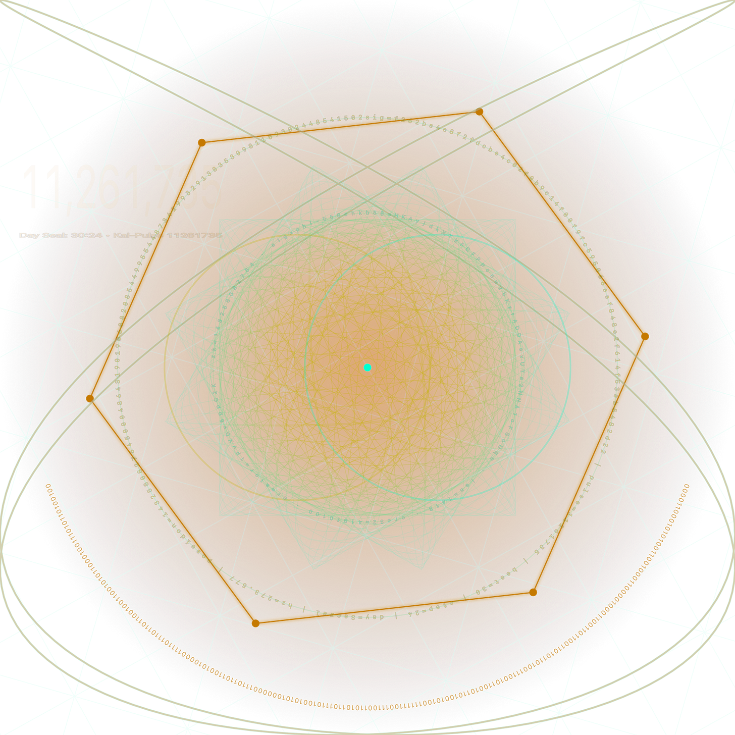 The Kai-Klok canon fixes the genesis anchor at 2024-05-10 06:45:41.888 UTC and defines the breath period as T=3+\sqrt5 seconds with daily closure N_{\text{day}}=17{,}491.270421 breaths/day. The repo also defines the annual lattice as 8 months × 7 weeks × 6 days = 336 Kai days/year.