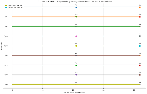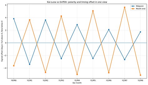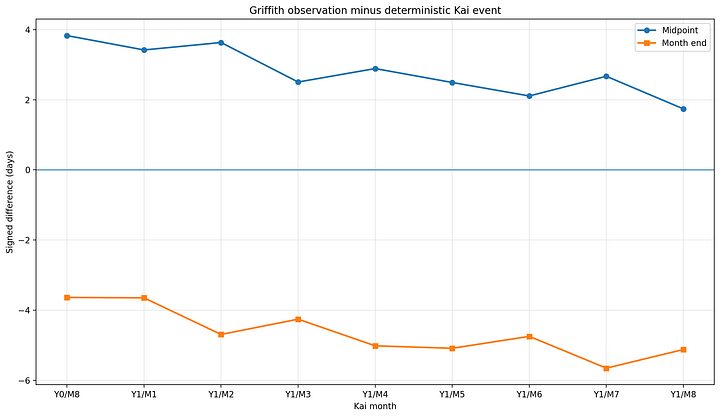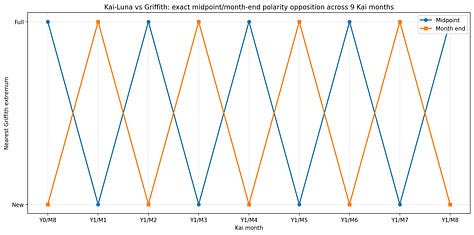 The key point is not that Kai midpoints and month ends equal astronomical syzygies exactly to the hour. The key point is that the deterministic Kai month engine produces a stable alternating opposition pattern against independent Griffith full/new observations across nine consecutive cycles without moon input.