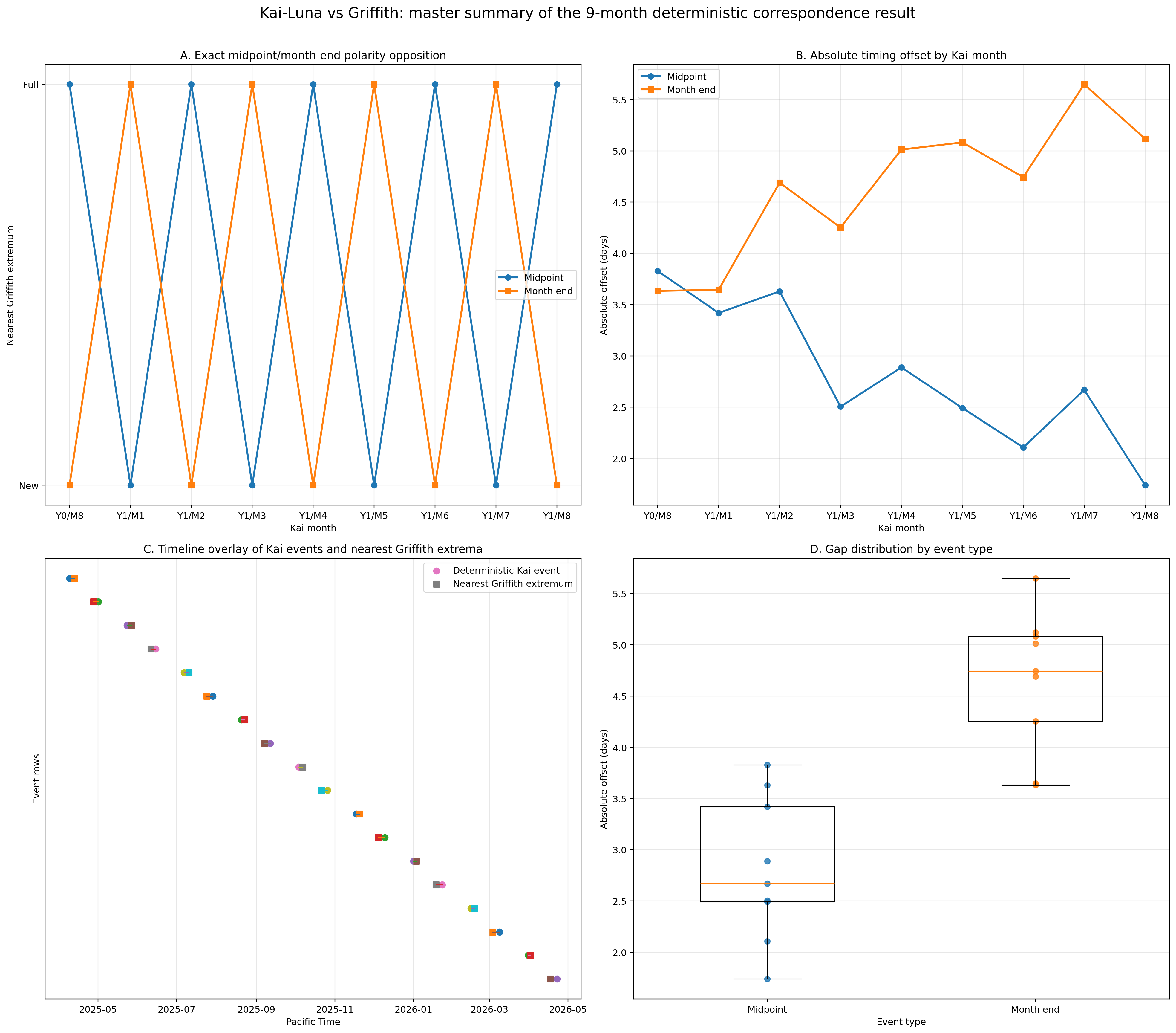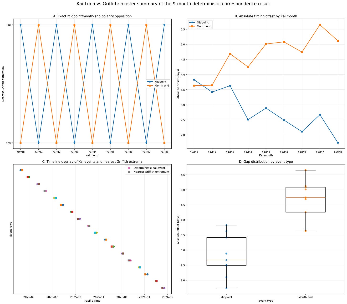 A single midpoint/end opposition could be dismissed as coincidence. Nine consecutive months of perfect nearest-extremum opposition cannot be honestly described that way without first denying either the published Kai-Klok constants or the published Griffith dates. The midpoint matches fall within 1.739 to 3.828 days of the nearest Griffith extremum, with mean absolute distance 2.809 days. The month-end matches fall within 3.634 to 5.649 days of the nearest Griffith extremum, with mean absolute distance 4.648 days. The numerical distances vary, but the polarity structure does not break once across the full nine-month run.