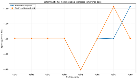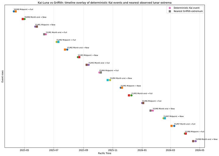 The result established here is not merely that a custom calendar can be compared to moon phases after the fact. The stronger result is that Kai-Klok publishes a month engine whose outputs are fixed a priori by public constants, while Griffith Observatory publishes independent full and new moon dates. When those two streams are overlaid across the last nine Kai months, the nearest Griffith extremum to the Kai midpoint forms a perfect alternating sequence, and the nearest Griffith extremum to the Kai month end forms the opposite perfect alternating sequence. This is a direct empirical correspondence layered on top of an oracle-free deterministic schedule.