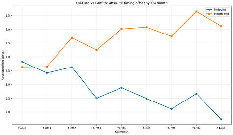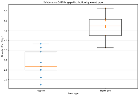 Across the nine-month run, midpoint absolute timing offsets to the nearest Griffith extremum range from 1.739 to 3.828 days, with mean offset approximately 2.809 days. Month-end offsets range from 3.634 to 5.649 days, with mean offset approximately 4.648 days. These statistics are computed directly from the table in Appendix F.