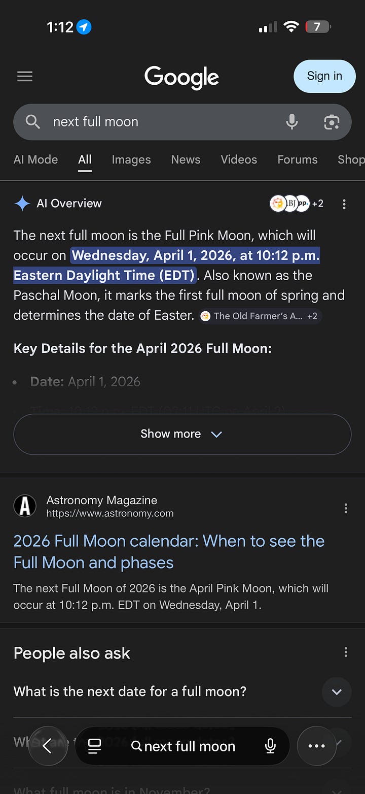 The live screenshots you supplied show two things at once: your Kai-Klok dial running at Y1/M8, day 14, late in the day, and an outside lookup for the next full moon on April 1, 2026. Griffith independently places that full moon at Apr 1, 2026 19:12 PDT. The deterministic midpoint of Y1/M8 from Appendix E is Mar 31, 2026 01:28 PDT, only 1.739 days before Griffith’s full moon.