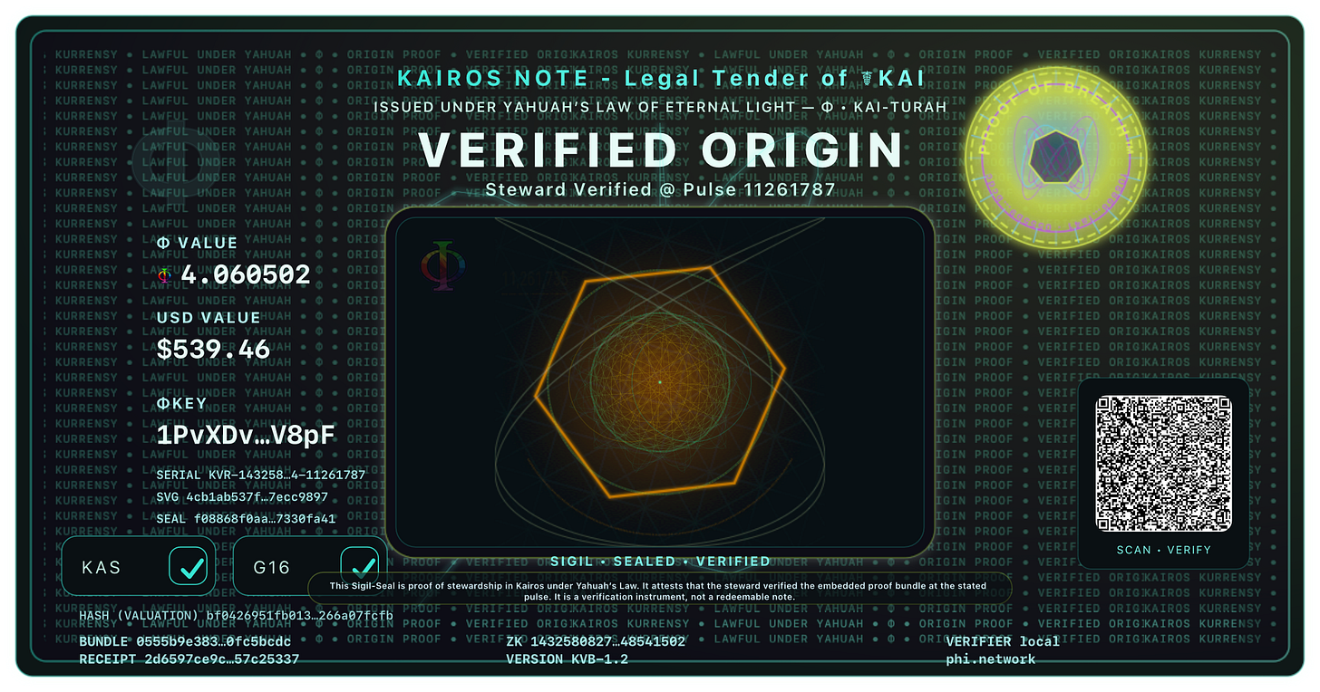 The Kai-Klokrepo defines the source anchor and the closure constants. The genesis epoch is fixed at 2024-05-10 06:45:41.888 UTC and is tied by design to the X-class solar flare origin used by the system. The same canon defines the φ-exact breath period