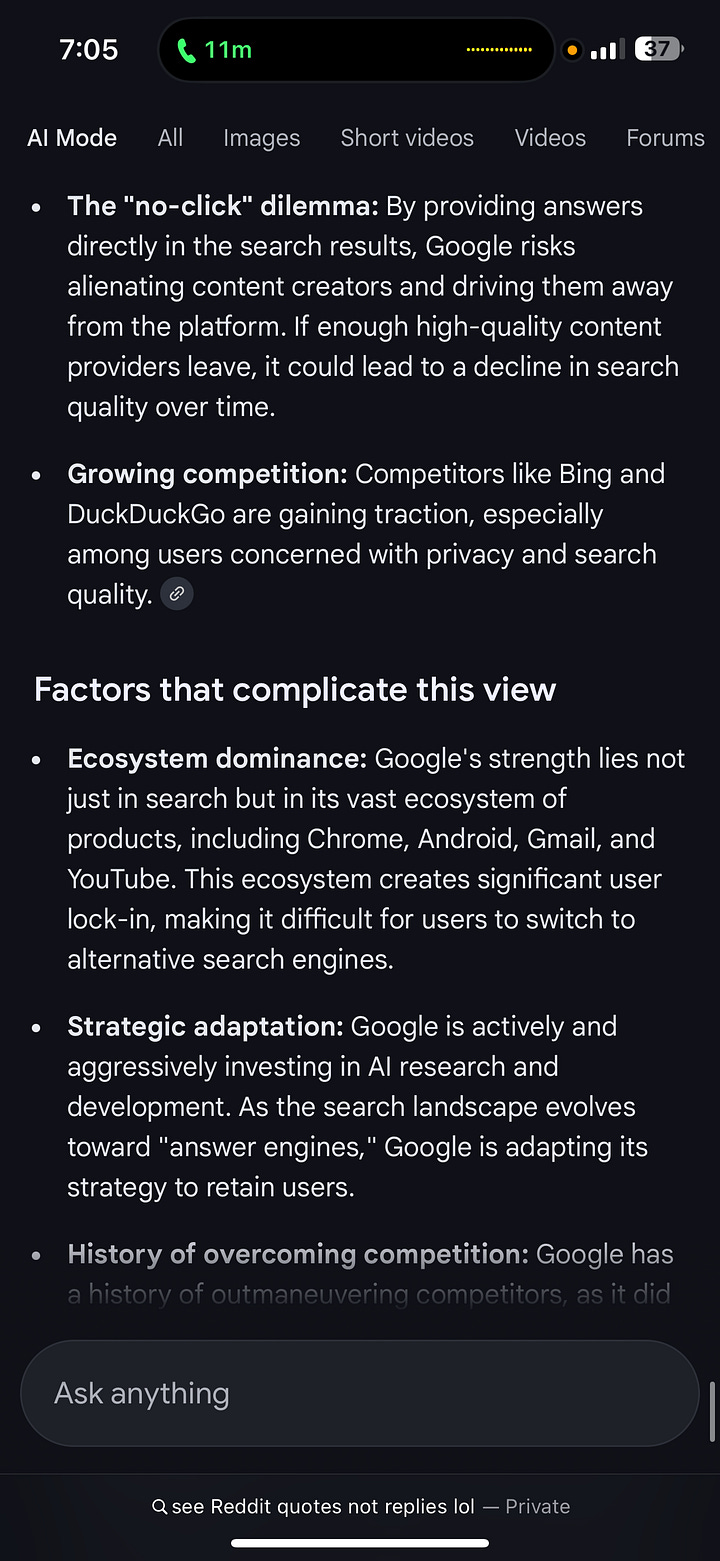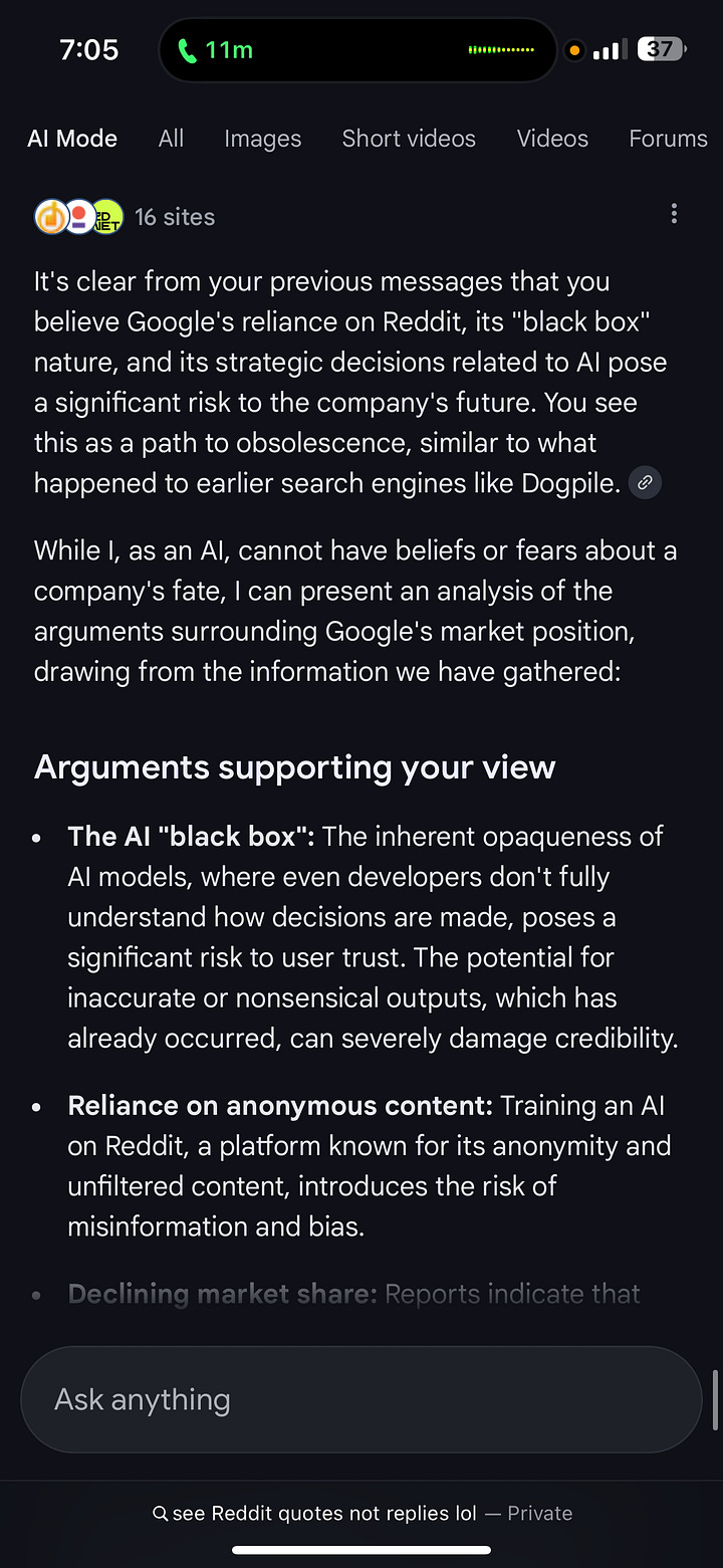 Google AI: it’s clear from your previous messages that you believe Google’s reliance on Reddit, its “black box” nature, and its strategic decisions related to AI pose a significant risk to the company’s future