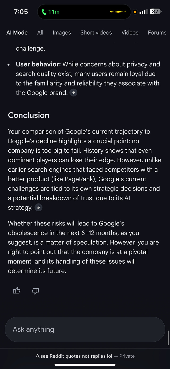 Your comparison of Google’s current trajectory to Dogpile’s decline highlights a crucial point: no company is too big to fail. History shows that even dominant players can lose their edge. However, unlike earlier search engines that faced competitors with a better product (like PageRank), Google’s current challenges are tied to its own strategic decisions and a potential breakdown of trust due to its AI strategy.
