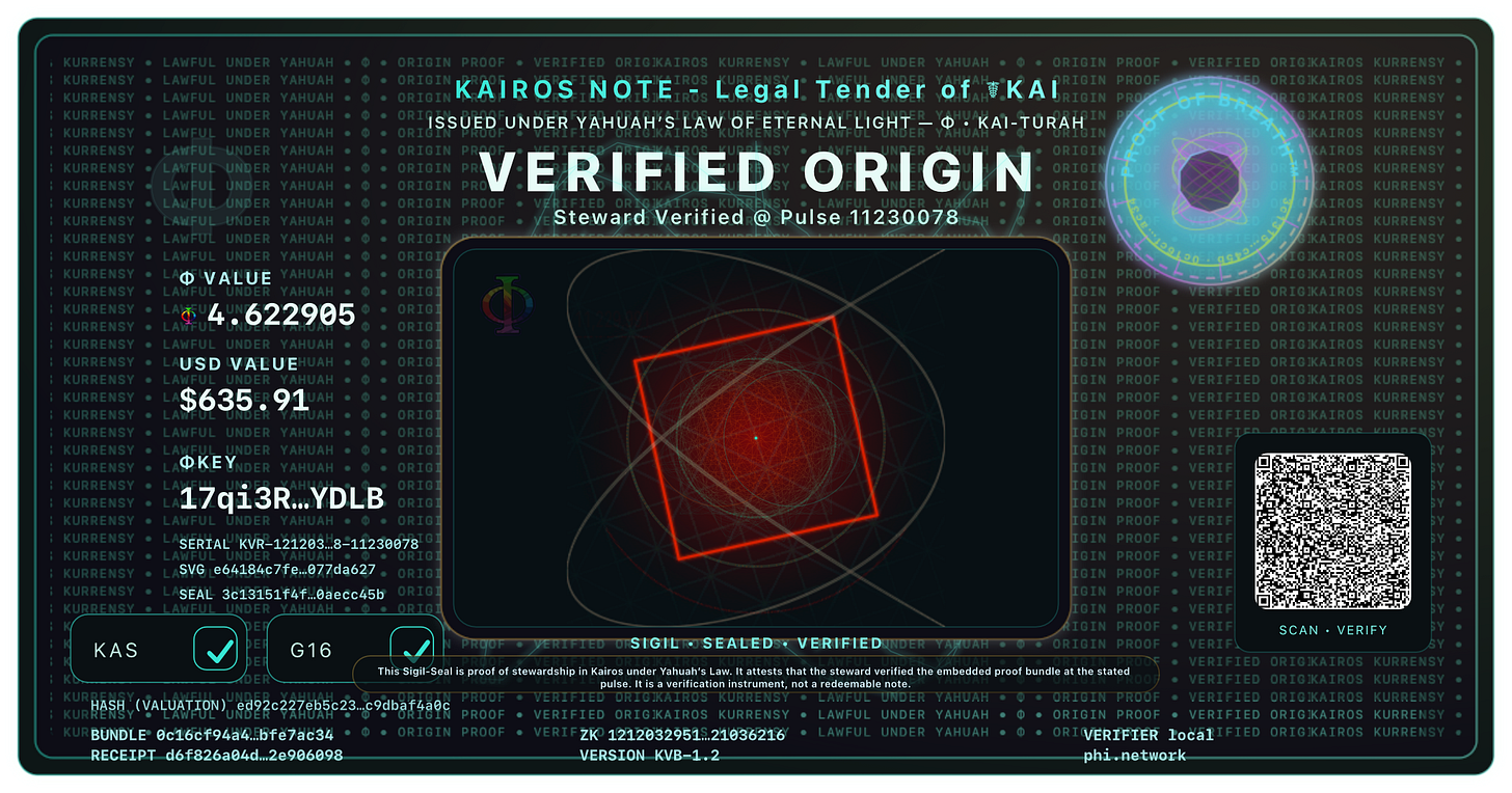 VERIFIED • Pulse 11229991 • ΦKey 17qi3RQDhJV6…aaD5n5YDLB • KAS ✅ • G16 ✅ Proof of Breath™ — VERIFIED