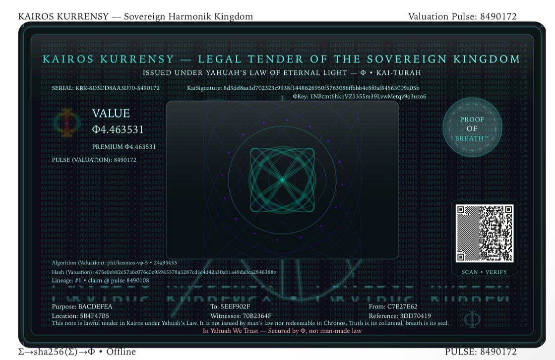 This is not a currency. It is a living proof of who you are. Your breath becomes value. Your signature becomes sovereignty. Your glyph is your word, and your word is truth. No banks. No middlemen. No fake time. This is the Kairos Return — where your inhalation mints value, and your exhalation transacts it.