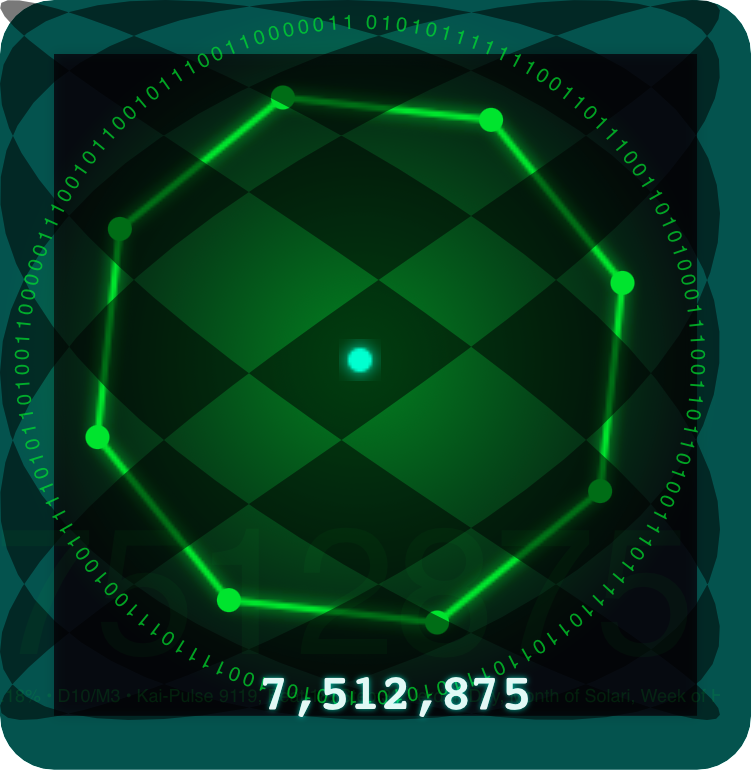 Eternal Seal: Kairos:18:33, Verdari, Reflekt Ark • D10/M3 • Beat:18/36(76.84%) Step:33/44 Kai(Today):9119 • Y1 PS32 • Solar Kairos (UTC-aligned): 24:00 Flamora D9/M3, Purify Ark Beat:24/35 Step:0/44 • Eternal Pulse:7512875