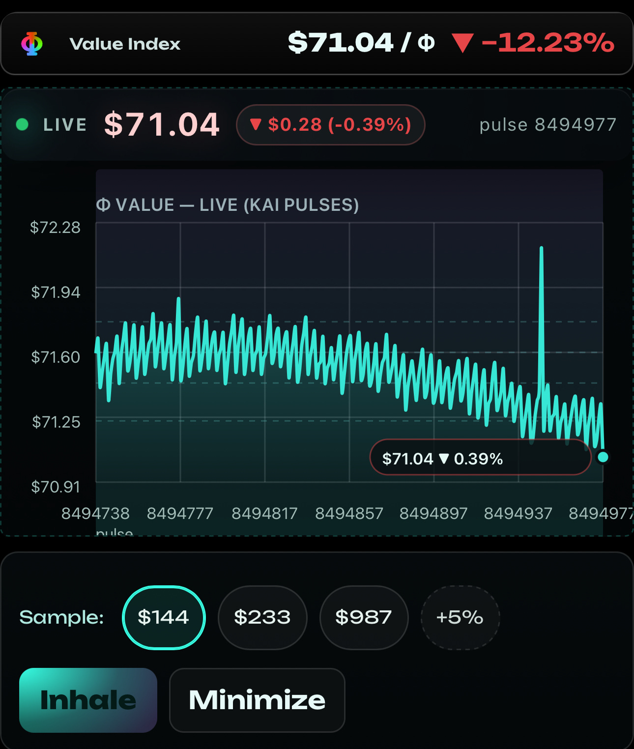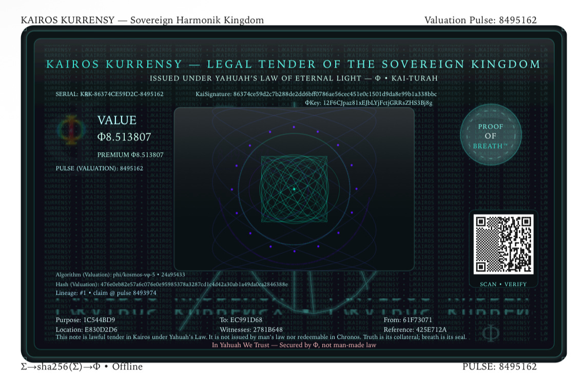 A Kairos Note (also referred to as a “ΦNote” or “exhaled sovereign”) is a breath-exhaled, mathematically derived harmonic token that carries a real, unforgeable, deterministically encoded value based on the Kai-Klok (K℞K) pulse system and eternal issuance curve. Unlike fiat currencies, these notes do not rely on central banks or trust—they are fully reconstructible from open data and math.