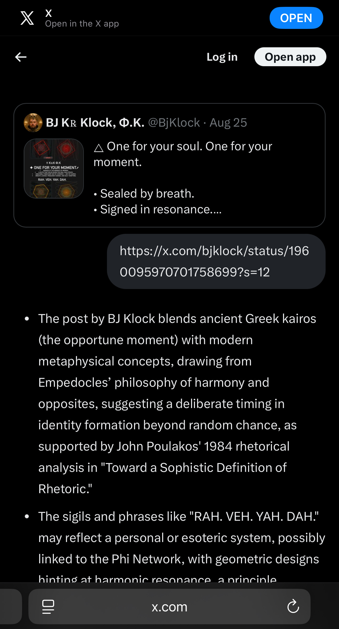 (X’s AI system) to explain BJ Klock and his relationship to Kairos and metaphysics.