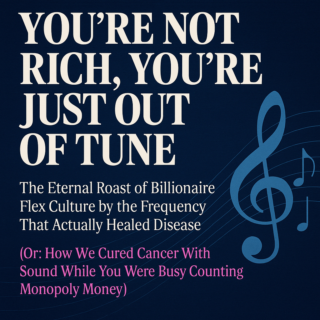 The Eternal Roast of Billionaire Flex Culture by the Frequency That Actually Healed Disease (Or: How We Cured Cancer With Sound While You Were Busy Counting Monopoly Money)